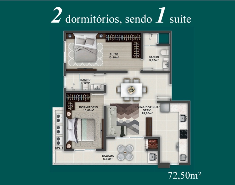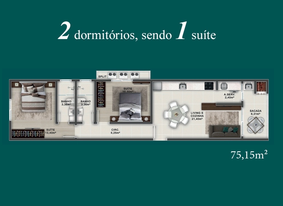 Aptos com 70,22m², 72,50m² e 75,15m² de área privativa
